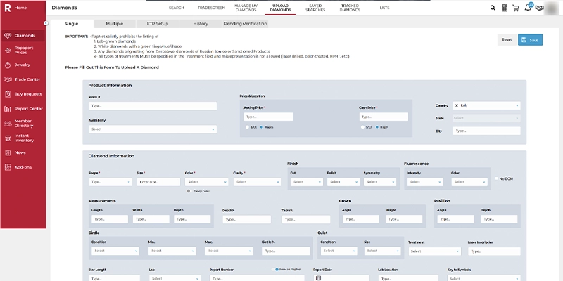 Diamonds upload API: Depending on the plan user chooses, they can upload diamonds for sale on the Rapnet website.